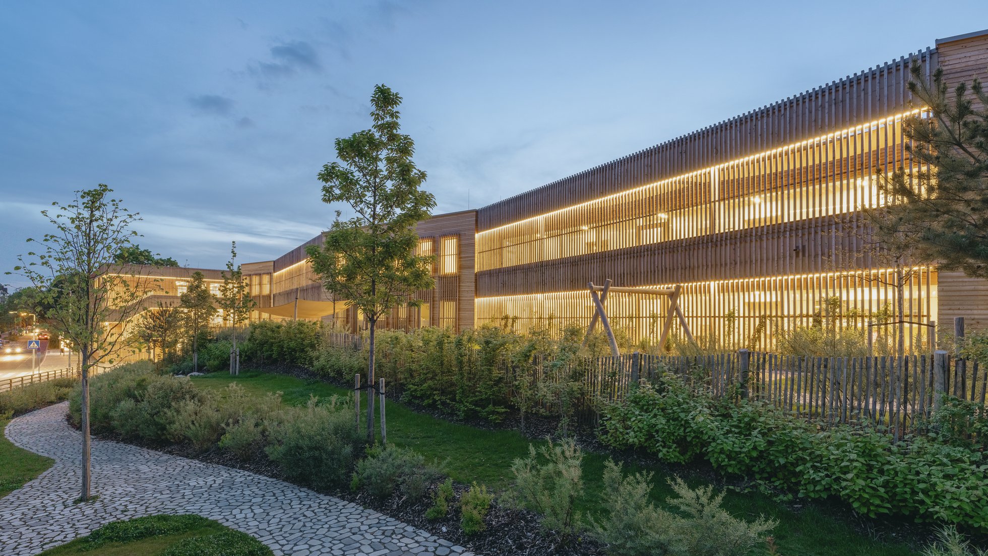 Die zwei Seiten des Städtebaus spiegeln sich in der gelungenen räumlichen Fügung und Materialität des Gebäudes wider. Die robuste Klinkerfassade zur Bahn im Norden schützt die Klassen- und Gruppenräume. Im Kontrast dazu bildet eine Holzfassade zur Gartenseite fließende Übergänge zum Außenraum in Form von wettergeschützten Loggien, die den innenliegenden Flur spielerisch ergänzen.