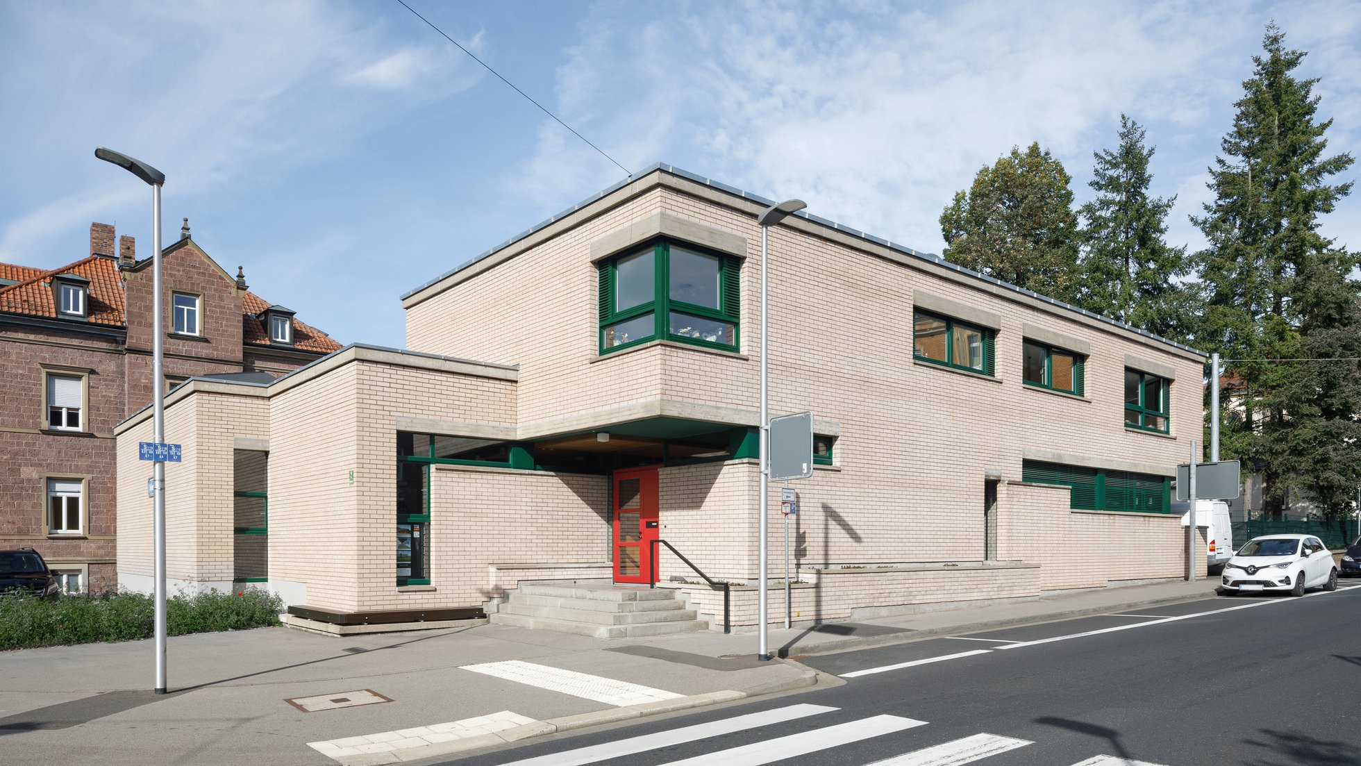 Der Neubau des Montessori Zentrums überzeugt, weil es sinnliche Erlebnisse im großen sowie im kleinen Maßstab anbietet. Städtebaulich bindet sich der Neubau gut ein und nutzt das schmale Grundstück optimal aus. Er schirmt einerseits das Wohnquartier zur Bahnlinie in Norden ab, anderseits umfasst das winkelförmige Gebäude eine üppig begrünte Außenanlage. Das Projekt bietet ein öffentlich zugängliches Sinneserlebnis in Form eines Duft- und Kräutergartens. Dieser ist elegant mit einen Stutzwand als städtebauliche Kante entlang der Straße gefasst, aber nicht versteckt.