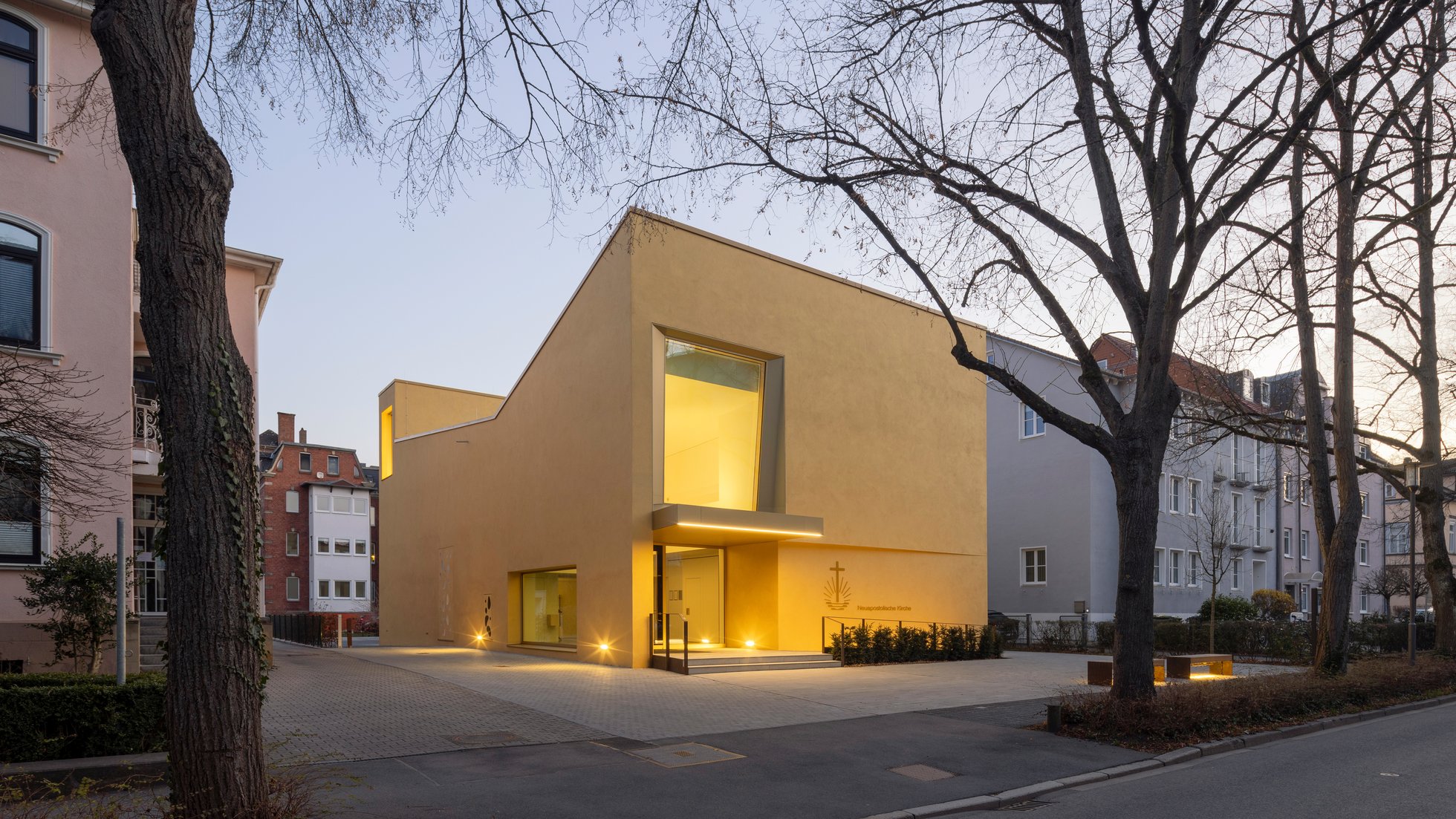 Als Abschluss einer Wohnhauszeile in Coburg ist das neue Kirchengebäude der Neuapostolischen Kirche entstanden. Das Gebäude öffnet sich selbstbewusst mit einem großzügigen Eingang zum Vorplatz der Kirche und nimmt mit ihrer Frontfassade die Höhe der sich anschließenden Bebauung auf. Die etwas expressive Form und die Farbgebung des Bauwerkes hebt es aus der Umgebung der umstehenden Wohngebäude hervor und verleiht dem Haus die ihm zustehende Besonderheit als öffentliches Gebäude.