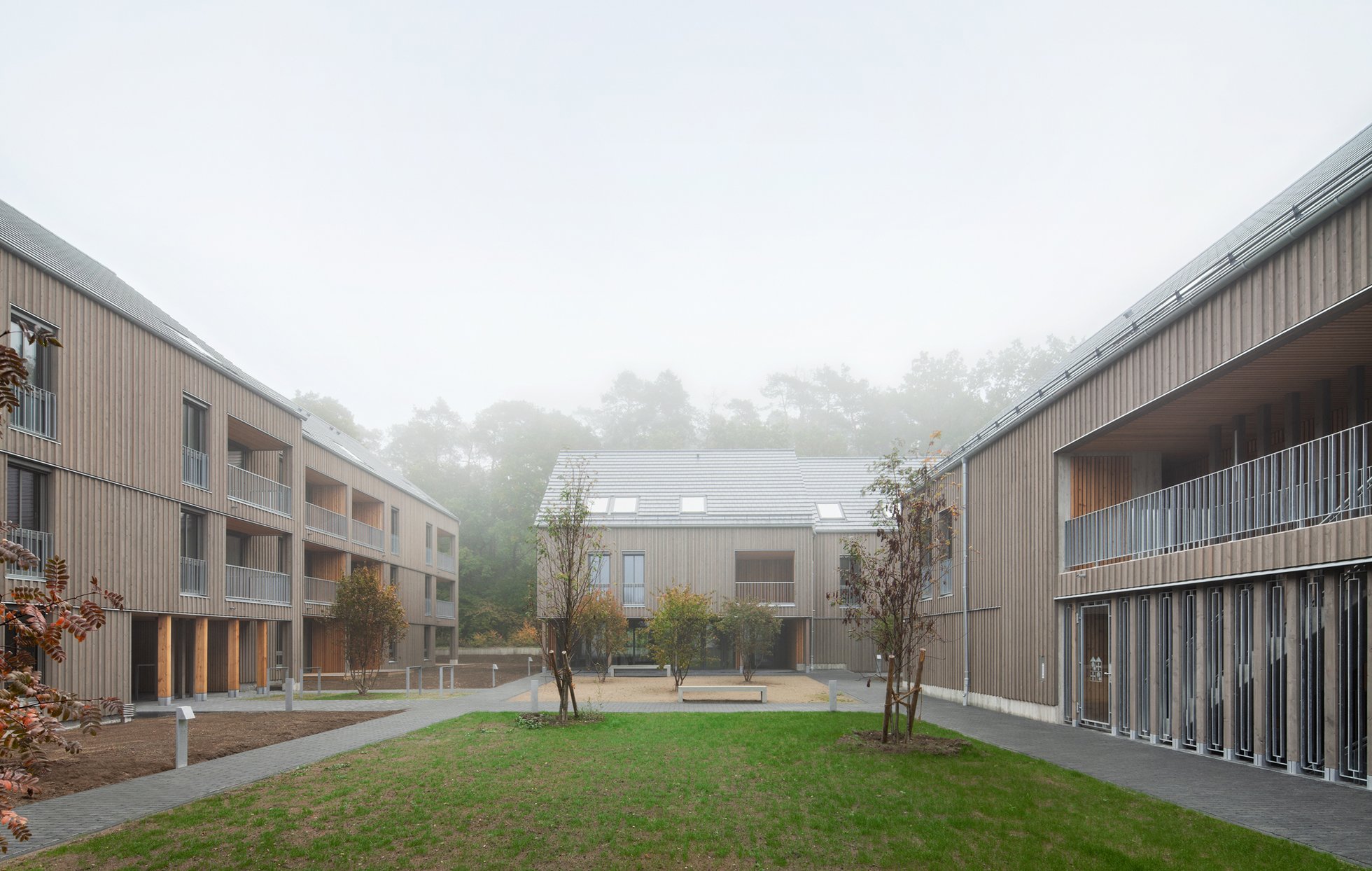 Die drei Baukörper erscheinen durch die Versetzung der Gebäude kleinteilig. Sie fassen einen Innenhof und heben sich unspektakulär aus dem städtebaulichen Kontext der einfachen verputzten Reihenhäuser- und Siedlungsbauten ab. Sie bieten Übergänge für die Nachbarn zum dahinter liegenden Grünraum und leisten eine Qualität für das ganze Quartier.
